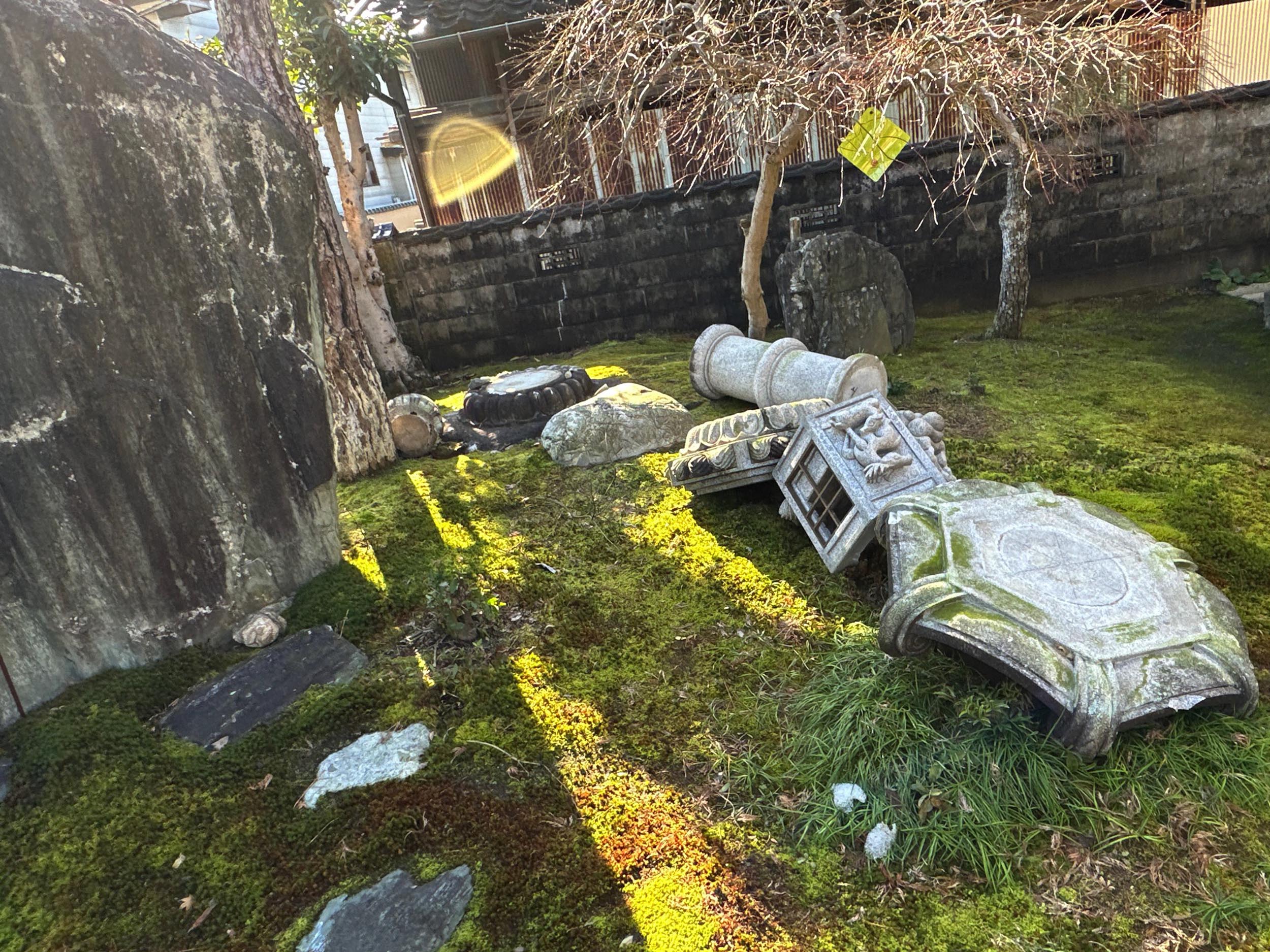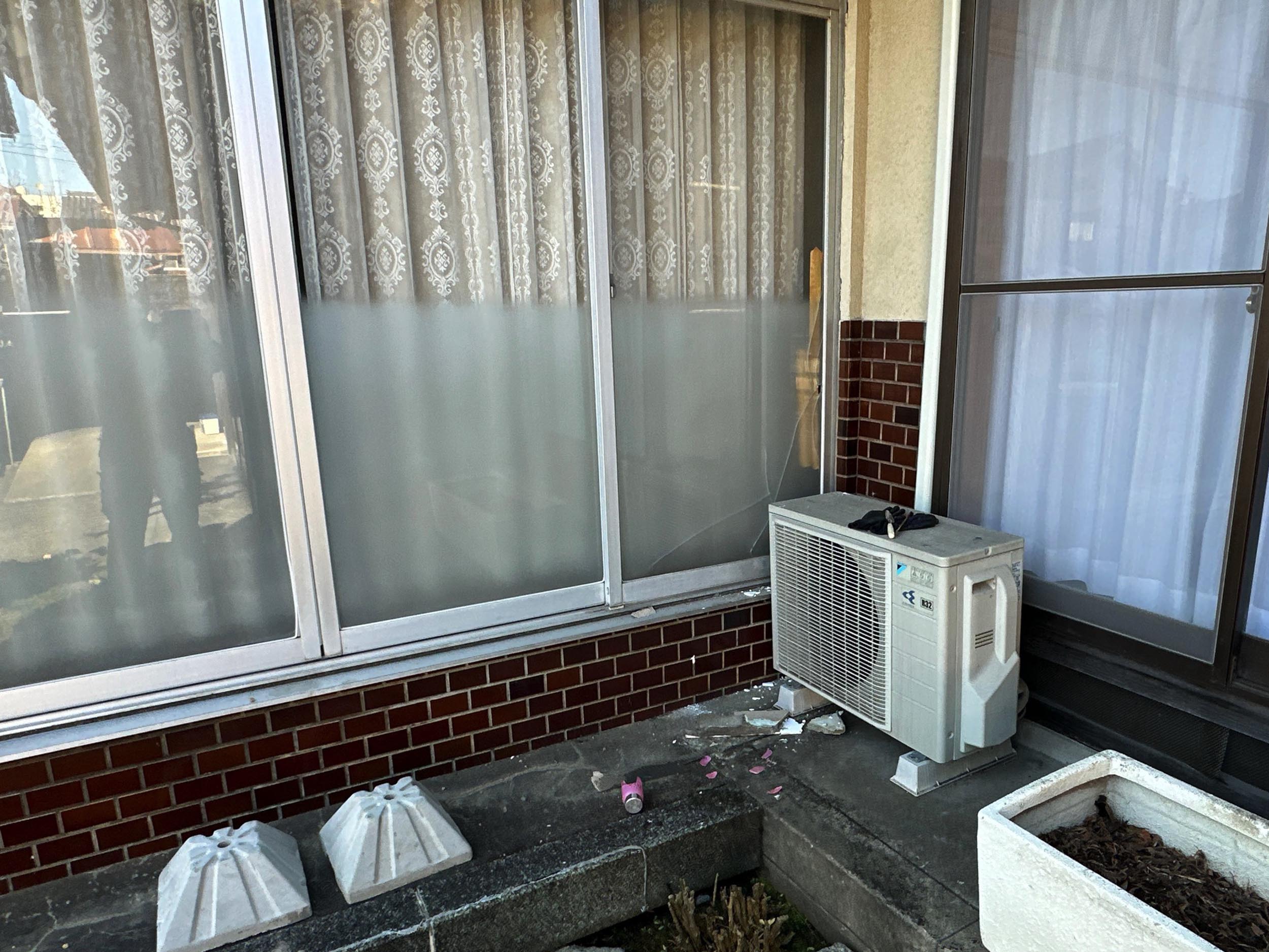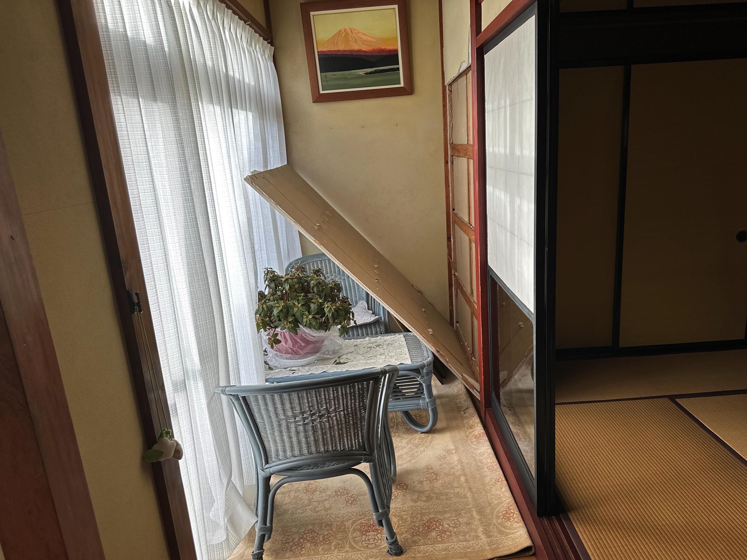 地震庭灯篭倒壊による住宅建具・家具破損二次被害